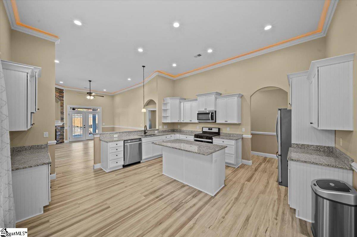 Enjoy low-maintenance, single-story living in this 3 bedroom, 2.5 bath home for sale in Simpsonville, just outside Greenville, South Carolina. Built in 2021 and offering over 2,100 square feet, this move-in ready home sits in a quiet neighborhood with no through traffic and sidewalks, yet is close to everything: approximately 1 mile to Publix and Walmart, 3 miles to Target, and only 5 minutes to Interstate 385 for an easy commute into Greenville. Inside, you'll find upgraded laminate flooring in all rooms, an open floor plan, a stunning stone fireplace in the living room, and a large kitchen with generous granite counter space and island that works beautifully for cooking, hosting, and entertaining—and all appliances remain. For added convenience and storage, a butler's pantry and a walk-in food pantry connect the formal dining room and kitchen. The spacious primary suite features a large bathroom with a recently updated shower including new accessibility bars and new bath fixtures, plus an upgraded tray ceiling with enhanced lighting. Step outside to an upgraded patio with pavers and a retaining wall, along with in-ground irrigation to help keep the yard looking its best with minimal effort. This Simpsonville home is also just 10 minutes from Bridgeway Station, the anticipated future home of the Greenville Triumph soccer stadium, as well as the new Kawonu Golf Course opening in 2027. With its convenient location close to shopping, dining, recreation, and major commuter routes, this home offers the ideal blend of comfort, convenience, and modern single-story living in the Greater Greenville area.